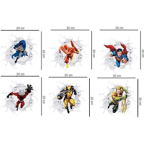 Adesivo de parede 3d super herois As imagens anunciadas são ilustrativas Tamanho do adesivo O adesivo da foto parece grande Então atenção: O modelo que está na foto não se refere ao tamanho do adesivo anunciado. deixamos o adesivo grande para que você possa visualizar melhor o produto que está comprando
