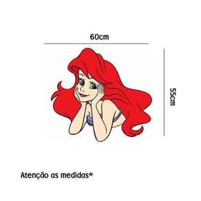 Adesivo de parede ariel Medida: 60 x 65 cm As imagens anunciadas são ilustrativas Tamanho do adesivo O adesivo da foto parece grande Então atenção: O modelo que está na foto não se refere ao tamanho do adesivo anunciado. deixamos o adesivo grande para que você possa visualizar melhor o produto que está comprando