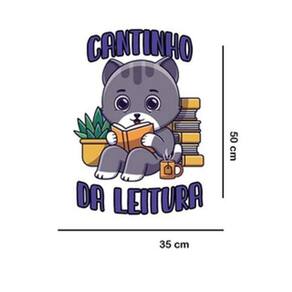 Adesivo de parede cantinho da leitura - gato Medida: 35 x 50 cm As imagens anunciadas são ilustrativas Tamanho do adesivo O adesivo da foto parece grande Então atenção: O modelo que está na foto não se refere ao tamanho do adesivo anunciado. deixamos o adesivo grande para que você possa visualizar melhor o produto que está comprando