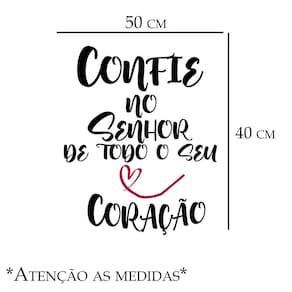 Adesivo de parede confie no senhor Medida: 50 x 40 cm As imagens anunciadas são ilustrativas Tamanho do adesivo O adesivo da foto parece grande Então atenção: O modelo que está na foto não se refere ao tamanho do adesivo anunciado. deixamos o adesivo grande para que você possa visualizar melhor o produto que está comprando Vantagens: - já vai recortado - fácil aplicação e sem sujeira, não precisa de cola. - acompanha manual impresso. - renovação do ambiente. É o fim das paredes brancas, sem vida Onde aplicar Em qualquer superfície lisa. Onde não aplicar Paredes úmidas, superfícies porosas, com relevo, com texturas, irregularidades ou com infiltrações. Local para aplicação: aplique onde sua imaginação mandar paredes, móveis, revestimentos, azulejos, tetos, janelas, portas, vitrines, vidraças, , carros, notebook, banheiro, geladeira e muito mais. Marca: Lojinha Da Luc Adesivos Ean: 8001250004161