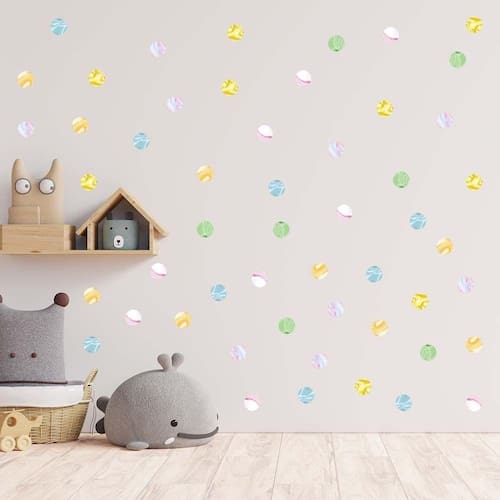 Adesivo De Parede Decorativo Bolinhas 2 medidas MEDIDAS - Kit 1 folha com: * 16 bolinhas rosas - 5cmx5cm * 16 bolinhas azuis - 5cmx5cm * 16 bolinhas verdes - 5cmx5cm * 16 bolinhas laranja - 5cmx5cm * 16 bolinhas amarelas - 5cmx5cm * 12 bolinhas rosas - 8cmx8cm * 12 bolinhas azuis - 8cmx8cm * 12 bolinhas verdes - 8cmx8cm * 8 bolinhas laranjas - 8cmx8cm * 8 bolinhas amarelas - 8cmx8cm MATERIAL -adesivo vinílico fosco não tóxico TIPO DE IMPRESSÃO - Impressão em alta resolução livre de imperfeições. OBSERVAÇÕES Podem ser colocados no quarto das crianças, na sala de estudos, no escritório, na geladeira, na sala de brinquedos, no box do banheiro ou em muitos outros lugares. A aplicação é muito simples, é só tirar o adesivo e colar como quiser. Os Adesivos já seguem com os recortes para agilizar e facilitar sua instalação, cortes feitos com alta precisão no momento da impressão para garantir a melhor qualidade. Podem ser aplicados em paredes lisas, com tinta acetinada, latex e acrílica, móveis, espelhos, portas, box de banheiro, livres de poeira ou pó de gesso. Não aplicar sobre tinta fresca, tinta magnética, superfícies irregulares ou texturizadas, locais com infiltrações. * Imagem ambiente ilustrativa PRODUTO NÃO TOXICO
