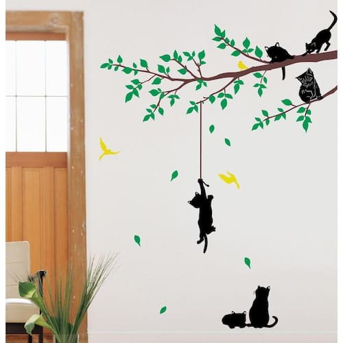Adesivo de parede decorativo gatos brincando na arvore colorido