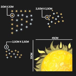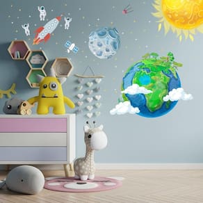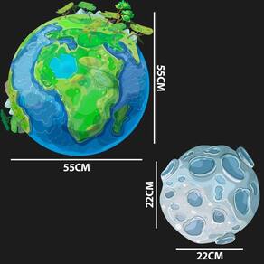 Adesivos de Parede Decorativos Planeta Terra MEDIDAS -Kit 1 folha de 70 cm x 122 cm com 68 itens: * 1 Terra de 55 cm x 55 cm * 1 Lua de 22 cm x 22 cm * 1 Sol de 35 cm x 35 cm * 1 Foguete de 30 cm x 13 cm * 1 Astronauta laranja de 7 cm x 4 cm * 2 Astronautas de 6 cm x 3 cm * 1 Nuvem de 20 cm x 7 cm * 2 Nuvens de 22 cm x 10 cm * 1 Satélite de 5,5 cm x 3,5 cm * 1 Satélite de 11 cm x 13 cm * 56 estrelas em 3 formatos diferentes. MATERIAL -adesivo vinílico fosco não tóxico TIPO DE IMPRESSÃO - Impressão em alta resolução livre de imperfeições. OBSERVAÇÕES Podem ser colocados no quarto das crianças, na sala de estudos, no escritório, na geladeira, na sala de brinquedos, no box do banheiro ou em muitos outros lugares. A aplicação é muito simples, é só tirar o adesivo e colar como quiser. Os Adesivos já seguem com os recortes para agilizar e facilitar sua instalação, cortes feitos com alta precisão no momento da impressão para garantir a melhor qualidade. Podem ser aplicados em paredes lisas, com tinta acetinada, latex e acrílica, móveis, espelhos, portas, box de banheiro, livres de poeira ou pó de gesso. Não aplicar sobre tinta fresca, tinta magnética, superfícies irregulares ou texturizadas, locais com infiltrações. * Imagem ambiente ilustrativa PRODUTO NÃO TOXICO