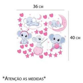 Adesivo de parede elefantinho Medida: 36 x 40 cm As imagens anunciadas são ilustrativas Tamanho do adesivo O adesivo da foto parece grande Então atenção: O modelo que está na foto não se refere ao tamanho do adesivo anunciado. deixamos o adesivo grande para que você possa visualizar melhor o produto que está comprando