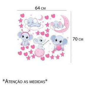 Adesivo de parede elefantinho Medida: 64 x 70 cm As imagens anunciadas são ilustrativas Tamanho do adesivo O adesivo da foto parece grande Então atenção: O modelo que está na foto não se refere ao tamanho do adesivo anunciado. deixamos o adesivo grande para que você possa visualizar melhor o produto que está comprando