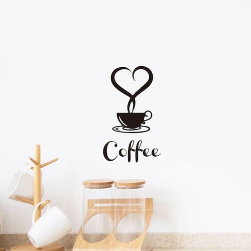 Adesivo de parede de café em forma de coração para cozinha e café, removível