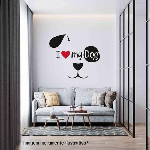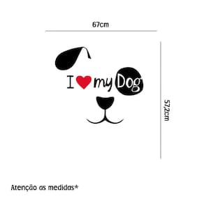 Adesivo de parede eu amo cachorro Medida: 67 x 58 cm As imagens anunciadas são ilustrativas Tamanho do adesivo O adesivo da foto parece grande Então atenção: O modelo que está na foto não se refere ao tamanho do adesivo anunciado. deixamos o adesivo grande para que você possa visualizar melhor o produto que está comprando