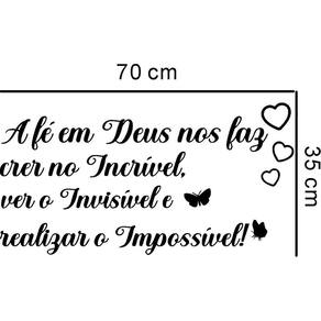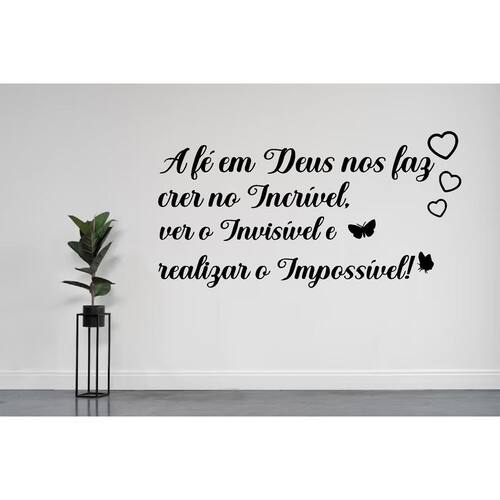 Adesivo de parede fé em deus Medida: 70 x 35 cm As imagens anunciadas são ilustrativas Tamanho do adesivo O adesivo da foto parece grande Então atenção: O modelo que está na foto não se refere ao tamanho do adesivo anunciado. deixamos o adesivo grande para que você possa visualizar melhor o produto que está comprando Vantagens: - já vai recortado - fácil aplicação e sem sujeira, não precisa de cola. - acompanha manual impresso. - renovação do ambiente. É o fim das paredes brancas, sem vida Onde aplicar Em qualquer superfície lisa. Onde não aplicar Paredes úmidas, superfícies porosas, com relevo, com texturas, irregularidades ou com infiltrações. Local para aplicação: aplique onde sua imaginação mandar paredes, móveis, revestimentos, azulejos, tetos, janelas, Portas, vitrines, vidraças, , carros, notebook, banheiro, geladeira e muito mais. Marca: Lojinha Da Luc Adesivos Ean: 1070000013613