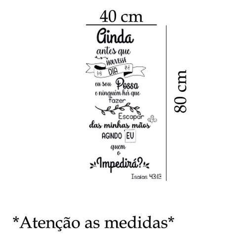 Adesivo de parede frase isaías 43:13 mod01 Medida: 40 x 80 cm Atenção as medidas Os adesivos decorativos são produzidos com material de alta qualidade. As imagens anunciadas são ilustrativas