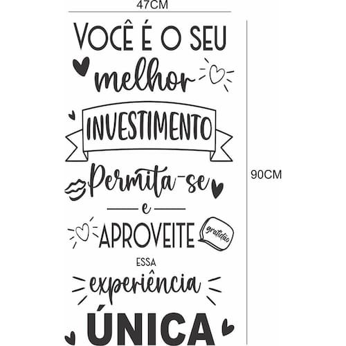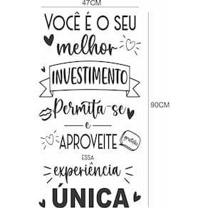 Adesivo de Parede Frase Você é seu Melhor Investimento Os Adesivos de Parede da Colakoala são ideais para decorar o Berçário ou quartinho do seu bebê, a sala de estar, a cozinha ou cantinho do café, Também cai muito bem no Espaço Kids, além de ser muito fácil de instalar. Essa é uma compra que você não irá se arrepender