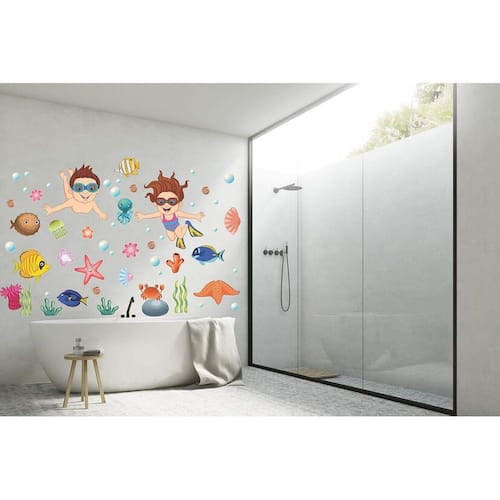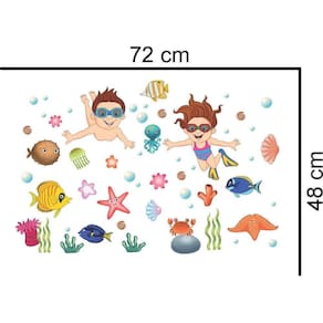 Adesivo de parede fundo do mar Medida: 72 x 48 cm As imagens anunciadas são ilustrativas Tamanho do adesivo O adesivo da foto parece grande Então atenção: O modelo que está na foto não se refere ao tamanho do adesivo anunciado. deixamos o adesivo grande para que você possa visualizar melhor o produto que está comprando