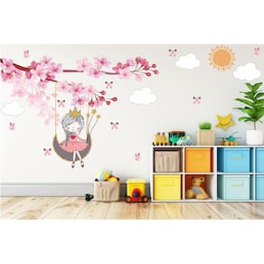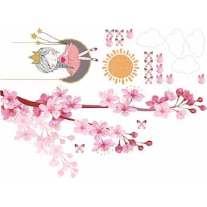 Medida: Contém: 01 Adesivo de Cerejeira medindo 1,15 x 50cm 01 Adesivo da Princesa sentada na lua medindo 53x30cm 01 Adesivo de Sol medindo 20cm 04 Nuvens de 15cm 10 Borboletas para espalhar