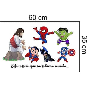 Adesivo de parede meu grande herói Medida: 60 x 35 cm As imagens anunciadas são ilustrativas Tamanho do adesivo O adesivo da foto parece grande Então atenção: O modelo que está na foto não se refere ao tamanho do adesivo anunciado. deixamos o adesivo grande para que você possa visualizar melhor o produto que está comprando Vantagens: - já vai recortado - fácil aplicação e sem sujeira, não precisa de cola. - acompanha manual impresso. - renovação do ambiente. É o fim das paredes brancas, sem vida Onde aplicar Em qualquer superfície lisa. Onde não aplicar Paredes úmidas, superfícies porosas, com relevo, com texturas, irregularidades ou com infiltrações. Local para aplicação: aplique onde sua imaginação mandar paredes, móveis, revestimentos, azulejos, tetos, janelas, portas, vitrines, vidraças, , carros, notebook, banheiro, geladeira e muito mais. Marca: Lojinha Da Luc Adesivos Ean: 8001250002532