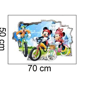 Adesivo de parede mickey e minnie andando de bike Medida: 70 x 50 cm As imagens anunciadas são ilustrativas Tamanho do adesivo O adesivo da foto parece grande