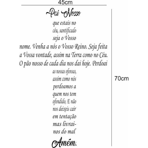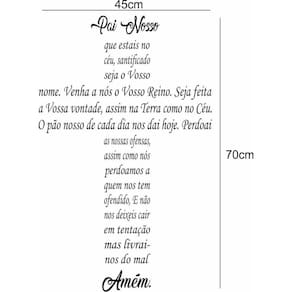 Adesivo de Parede Oração do Pai Nosso em Forma de Cruz Transforme sua casa em um oásis de estilo e personalidade com os nossos incríveis adesivos de parede. Se você está buscando uma maneira fácil e econômica de renovar o ambiente sem obras ou sujeira, nossos adesivos são a solução perfeita. Com uma variedade de designs modernos e exclusivos, criamos um produto que combina qualidade, praticidade e beleza para transformar qualquer espaço em um cenário encantador. Adesivo de Parede Oração do Pai Nosso em Forma de Cruz Medida: O Adesivo completo mede 70 x 45cm Adesivo de Vinil auto-colante com recorte Garantia de 3 meses e durabilidade de 5 anos para uso interno e 2 anos para uso externo Nossos adesivos são de fácil instalação, não havendo a necessidade de experiência ou habilidades especiais É só destacar e colar. Acompanha Manual de instalação Sinta o prazer de fazer você mesmo de forma profissional e com toque único e pessoal. Deixe seu cantinho único como você. Seja Bem vindo/a e boas compras
