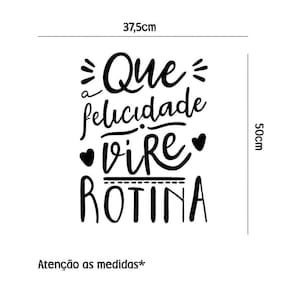 Adesivo de parede que a felicidade vire rotina Medida: 38 x 50 cm As imagens anunciadas são ilustrativas Tamanho do adesivo O adesivo da foto parece grande