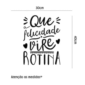Adesivo de parede que a felicidade vire rotina Medida: 30 x 40 cm As imagens anunciadas são ilustrativas Tamanho do adesivo O adesivo da foto parece grande