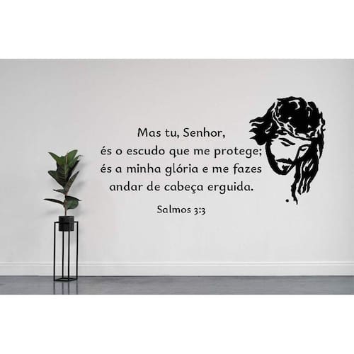 Adesivo de parede salmo 3:3 Medida: 60 x 32 cm As imagens anunciadas são ilustrativas Tamanho do adesivo O adesivo da foto parece grande Então atenção: O modelo que está na foto não se refere ao tamanho do adesivo anunciado. deixamos o adesivo grande para que você possa visualizar melhor o produto que está comprando