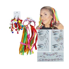 Contém: 3 Cartelas de adesivo Face Jewels + 1 Par Brincos Pompom + 1 Par Elásticos de Cabelo com Fitas.