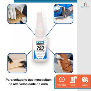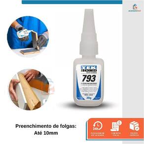 CARACTERÍSTICAS TÉCNICAS: Material: Cianoacrilato Temperatura de operação: -55 a 80 ºC Preenchimento de folgas: Até 10 mm Resistência ao Cisalhamento (Aço x Aço): = 100Kgf/cm2 Textura: Líquida Viscosidade: 70 a 120 cP Cura total: 24 hrs Local indicado: Multiuso Tipos de adesivo: Selante Tipo de colagem: Instantânea Local de aplicação: Uso Geral Cor: Branco Peso líquido: 20g Marca: Tekbond Ref.: 3698424