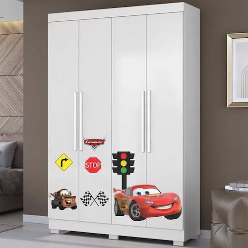 Adesivo para guarda roupa relâmpago mcqueen Medida: 66 x 43 cm As imagens anunciadas são ilustrativas Tamanho do adesivo O adesivo da foto parece grande Então atenção: O modelo que está na foto não se refere ao tamanho do adesivo anunciado. deixamos o adesivo grande para que você possa visualizar melhor o produto que está comprando