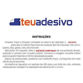 Limpeza: Primeiro faça uma limpeza completa na área a ser aplicado o adesivo, para que a mesma fique livre de qualquer tipo de impureza, tais como: poeira, óleo, graxa, cera, silicone e etc.