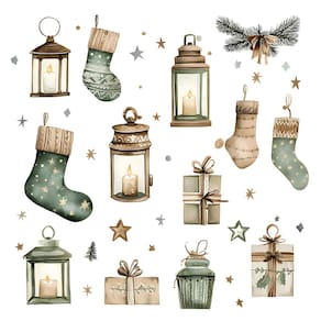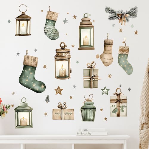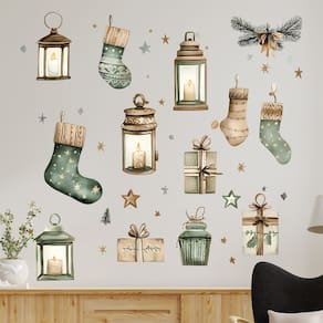 Adesivos de parede, lanterna de Natal, vela, meia, caixa de presente