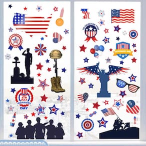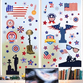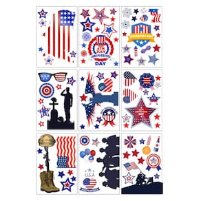 Material: PVC Tamanho: 20x29 cm Conjunto de design patriótico de 9 folhas — inclui bandeira dos EUA, Estátua da Liberdade, silhueta de soldado, estrelas, fogos de artifício e motivos do Dia da Independência para um tema festivo americano. Material de PVC durável — Feito de vinil impermeável e ecológico, garantindo cores brilhantes, resistência a rasgos e uso decorativo duradouro. Fácil de aplicar e remover — O design autoadesivo permite a instalação rápida de descascar e colar em superfícies lisas e a remoção limpa sem danos. Perfeito para feriados e eventos — Ideal para 4 de julho, Dia dos Veteranos, Dia da Memória ou festas patrióticas, criando uma forte atmosfera festiva. Aplicação em várias superfícies — Funciona bem em paredes, janelas, espelhos, portas ou móveis, trazendo opções versáteis de decoração para sua casa ou escritório.