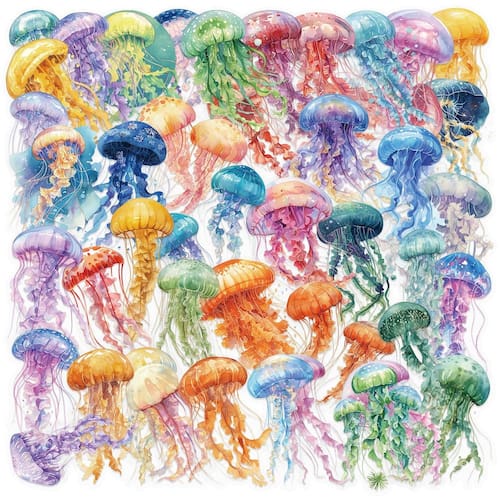 50 designs vívidos de medusas — Inclui 50 decalques transparentes de medusas em tons pastel e aquarela, ideais para realçar qualquer superfície com um toque oceânico e etéreo. Material PET de alta qualidade — Feitos de PET à prova d'água, esses adesivos oferecem bordas nítidas, impressão vibrante e são perfeitos para colocar em camadas em diários e agendas. Transparente e à prova d'água — Cada decalque é à prova d'água e resistente a óleo, projetado para permanecer vivo e intacto mesmo em garrafas de água ou itens externos. Ampla variedade de aplicações — Ótimo para decorar laptops, skates, álbuns de recortes, diários, capas de telefone, guitarras e acessórios de viagem. Fácil de usar e remover — Descasque e cole facilmente sem rasgar ou deixar resíduos de adesivo, tornando-os adequados para crianças e adultos.