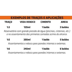 - Para qualquer traço ou tipo de areia, usar 40 ml de Veda Reboco por lata de areia (18 kg).