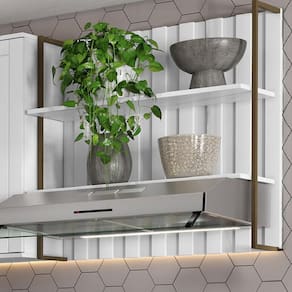 Aproveite agora mesmo para adquirir o Aéreo Ripado MDF Branco com Prateleiras e Tubo Ouro Velho Carraro e transforme sua cozinha com elegância e funcionalidade.