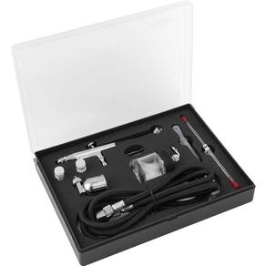 1 Aerógrafo com 15 acessórios. Acompanha: 3 bicos (0,2 mm, 0,3 mm e 0,5 mm), 3 agulhas (0,2 mm, 0,3 mm e 0,5 mm), 1 copo de metal 7 ml, 1 copo de vidro 22 ml, 1 chave, 1 mangueira 1,8 m, 1 conector 1/8" fêmea com espigão 1/4", 1 tudo de sucção e 2 adaptadores rápidos.