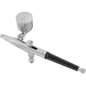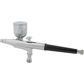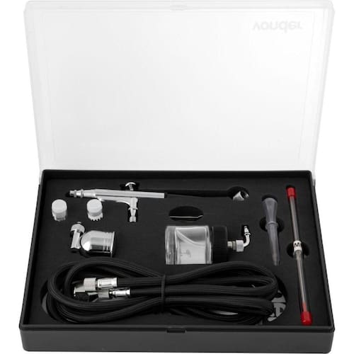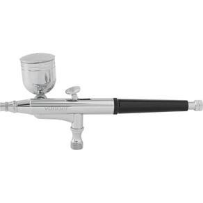 Conteúdo da embalagem: 1 Aerógrafo com 15 acessórios. Acompanha: 3 bicos (0,2 mm, 0,3 mm e 0,5 mm), 3 agulhas (0,2 mm, 0,3 mm e 0,5 mm), 1 copo de metal 7 ml, 1 copo de vidro 22 ml, 1 chave, 1 mangueira 1,8 m, 1 conector 1/8" fêmea com espigão 1/4", 1 tudo de sucção e 2 adaptadores rápidos.