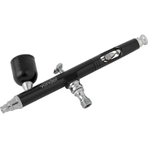 Conteúdo da embalagem: 1 Aerógrafo com 7 acessórios, sendo: 1 pistola com caneca 7 ml e válvula de entrada, 1 adaptador 1/4" fêmea x 1/8" macho, 2 adaptadores 1/8 com espiga, 1 tubo de sucção, 1 chave e 1 mangueira de ar de 1,8 m.