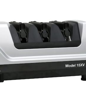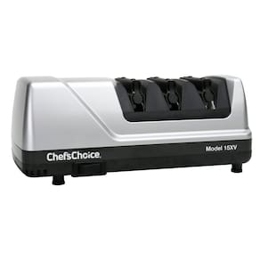 Afiador de facas elétrico profissional Chef'sChoice 15 Trizor XV EdgeSelect para facas retas e serrilhadas, abrasivos de diamante, sistema de afiação patenteado feito nos EUA, 3 estágios, cinza - Converta suas facas: ideal para converter bordas tradicionais de fábrica de 20 graus de facas domésticas em bordas Trizor XV de 15 graus de alto desempenho - Diâmetro: estágio avançado de estroboscopia e abrasivos 100% de diamante para afiar bordas retas e lâminas serrilhadas. O ruído está entre 65 dB e 75 dB - Fácil de usar: guias de mola flexíveis avançadas e patenteadas para ajuste automático e controle preciso do ângulo de afiação e apresentam um simples interruptor liga/desliga - Três estágios: sistema de afiação EdgeSelect de 3 estágios para versatilidade ideal para fornecer a borda perfeita para cada tarefa de corte. Os estágios 1 e 2 são banhados com abrasivos de diamante 100% para afiar e afiar a borda e o estágio 3 usa um sistema abrasivo flexível patenteado para polir e ajudar a prolongar a vida útil das facas serrilhadas - RAZOR AFIADO: o 15 Trizor XV combina a força e a durabilidade da borda Trizor com a tecnologia impecável e ultra-afiada XV de 15 graus. O tempo necessário para afiar é de aproximadamente 1 minuto para afiar pela primeira vez e o afiamento é de aproximadamente 10 segundos