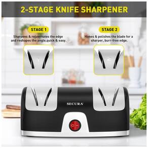 O sistema de afiação de dois estágios afia de forma rápida e fácil a maioria das lâminas não serrilhadas para resultados profissionais, você obterá uma lâmina afiada em segundos. Etapa 1 aumenta a nitidez e rejuvenesce a borda e remodela o ângulo, de forma rápida e fácil. Etapa 2 afia e dá polimento à lâmina e finaliza o processo de afiação. Forte e Segurança O Afiador de Facas de Cozinha Secura Com pés de ventosa antideslizantes para serviços pesados, mantenha o afiador firmemente no lugar durante o uso para evitar acidentes. Somente para uso com os padrões elétricos norte americanos, 120 V 60 Hz CA. AVISO não use com uma faca serrilhada Marca: Não Informado