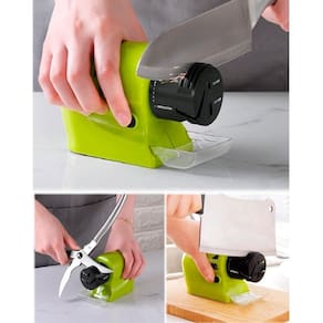 Afiador elétrico multifuncional para facas, tesouras e ferramentas manuais. Possui pedra de amolar de alta velocidade, acessório removível e coletor de pó. Requer 4 pilhas AA (não inclusas).Vendido e entregue por Olist Store