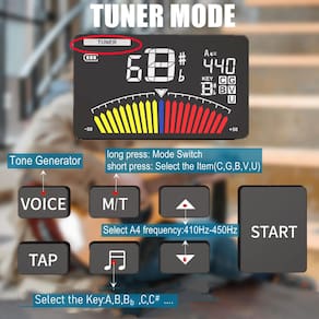 - ?Função de sintonizador?Capte o som através do terminal de captação e microfone na faixa de frequência de 430Hz-450Hz. Calibre o tom com precisão, o erro está dentro de ± 0,5 centavos de tom. Existem modos de afinação para guitarra, baixo, ukulele, violino e modos de afinação cromática. Também é adequado para muitos outros instrumentos como saxofone, trompete e violoncelo.