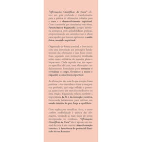 Afirmações Científicas de Cura é um guia revolucionário e transformador que oferece um caminho claro e eficaz para aqueles que desejam aprimorar a saúde física, mental e espiritual. Com a maestria única que caracteriza suas obras, Paramahansa Yogananda combina sabedoria atemporal com aplicabilidade prática, revelando como as afirmações podem ser uma poderosa ferramenta de cura e autodescoberta. Organizado de forma acessível e didática, o livro inicia com uma introdução aos princípios fundamentais das afirmações, explicando suas bases científicas e espirituais. A partir daí, oferece instruções detalhadas sobre como utilizar as afirmações de maneira profunda e impactante, criando uma verdadeira transformação interna. Cada capítulo é dedicado a um aspecto específico da cura, trazendo afirmações cuidadosamente formuladas para restaurar e revitalizar o corpo, fortalecer a mente e expandir a consciência espiritual. Com explicações científicas claras e acessíveis, Afirmações Científicas de Cura confere credibilidade a essa prática, tornando-a facilmente aplicável no cotidiano. Este não é apenas um manual de cura: é um convite para uma transformação interior profunda e para a descoberta do imenso potencial de cada ser humano. Ao seguir esse caminho, você não estará apenas curando o corpo e a mente, mas também desbloqueando uma nova dimensão de consciência e de possibilidades infinitas.
