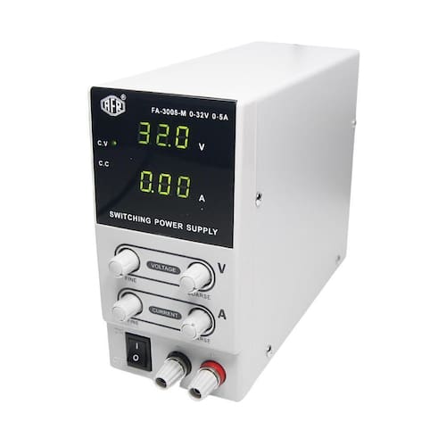 Equipamento digital de bancada, com dois displays de 3 dígitos tensão e corrente , capaz de fornecer uma saída variável com tensão de 0 a 32v dc e corrente de 0 a 5a dc. Possui ajuste de tensão e corrente ajustado por potenciômetro, além de proteção contra sobrecarga, curto circuito, super aquecimento e inversão de polaridade. de 1 ano Este produto é bivolt - 110 e 220volts Acompanha par de cabos para medição tipo jacaré Alta estabilidade e baixo ripple. Display 3 dígitos de fácil leitura para apresentação simultânea da tensão e corrente de saída. Saída variável: 0 32v, 0 5a. Ajuste de tensão e corrente através de potenciômetros de precisão. Ajustes grosso e fino de tensão e corrente. - alimentação: 127v / 220v 50/60hz . - visor: display led duplo - dimensões e peso: 205x160x85mm. - temperatura de operação: de 0º a 40ºc. - umidade de operação: menos que 80%. - pressão atmosférica: 86kpa104kpa. - modos de operação: tensão constante ou corrente constante. No máximo até 8 horas de uso contínuo. - modo de resfriamento: ventilação forçada por ventoinha. - limite de tensão/corrente: 32v 5a/ 10a - ripple: 200mvp-p. Acessórios: Um cabo de força do padrão brasileiro; Ponta de prova com garra jacaré; Manual de instruções. Marca: Não Informado