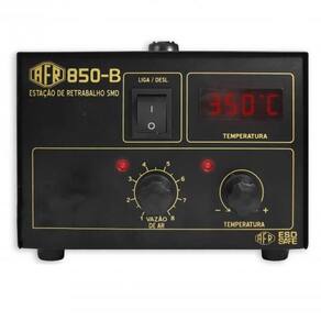 Estação de retrabalho - modelo digitalEstação digital para retrabalho com display de 3 dígitos.Possui controle de temperatura e vazão de ar. Foi especialmente desenvolvida para técnicos profissionais, no retrabalho em placas eletrônicas e componentes smd. Possui resfriamento automático e certificado inmetro.É ideal para trabalhos com componentes smd e até mesmo bga, a estação afr garante alta precisão no controle de temperatura do canhão de arRetrabalho ar quente Display digital com 3 dígitos Controle da temperatura na faixa de 150 a 500 c; Precisão de controle da temperatura: menor que 2% Gabinete esd dissipativo; Resfriamento automático; Bomba tipo diafragma; Vazão de ar: 0,3 24,0 l/min. ajustável ; Resistência: 250 watts Bomba consumo: 45 watts; Consumo total: 270 watts para 127v / 340w para 220v Tensão: 127 ou 220 volts; Terceiro fio de aterramento;2 anos de garantia contra defeitos de fabricação