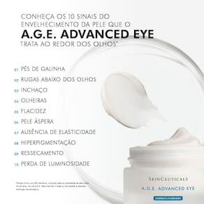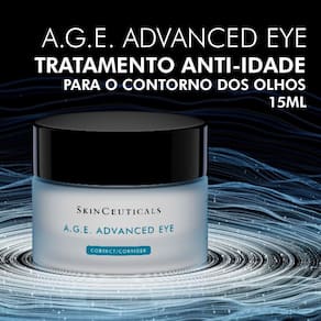A.G.E. Advanced Eye SkinCeuticals Corrige os 10 sinais visíveis do envelhecimento da pele ao redor dos olhos. Tratamento antirrugas para o contorno dos olhos que corrige os 10 sinais visíveis do envelhecimento da pele ao redor dos olhos: rugas abaixo dos olhos, pés de galinha, inchaço, olheiras, flacidez, textura irregular, ausência de elasticidade, hiperpigmentação, ressecamento e perda de luminosidade. A.G.E. Advanced Eye é um tratamento anti-idade de última geração para a região ao redor dos olhos que combate o aparecimento de olheiras, pés de galinha e inchaço, associados aos produtos finais de glicação avançada (A.G.E.s), um fator importante do processo natural de envelhecimento. Sua fórmula aveludada é indicada para a área ao redor dos olhos, possuindo uma combinação potente de ProxylaneTM, Flavonoides de Frutas Silvestres, Peptídeo Matrixyl 3000, Ácido Glicirretínico, cafeína e blend exclusivo de pérola e nitrato de boro. Esse blend possui efeito óptico sinérgico que ajuda a dispersar a luz e melhorar imediatamente a aparência de olhos cansados e com perda de luminosidade em todos os tons de pele. BENEFICIOS ° Reduz a aparência das linhas finas e pés de galinha ° Melhora a aparência de inchaço e olheiras ° Instantaneamente realça a luminosidade ao redor dos olhos, testado em todos os tons de pele ° Reestabelece a umidade da pele seca e com sinais de envelhecimento ° Livre de parabenos, fragrâncias e corantes MODO DE USO: Aplicar duas vezes ao dia de manhã e à noite sob os olhos seguindo a curva natural das maçãs do rosto e sobrancelhas. Não aplique diretamente nas pálpebras. De manhã, aplicar após SkinCeuticals C E Ferulic e A.G.E. Interrupter Advanced e em seguida finalizar com um protetor solar. À noite, aplicar após SkinCeuticals H.A. Intensifier A.G.E. Interrupter Advanced. Nunca se esqueça de higienizar bem a pele antes da aplicação dos produtos. Assim, a absorção e o tratamento terão maior eficácia.