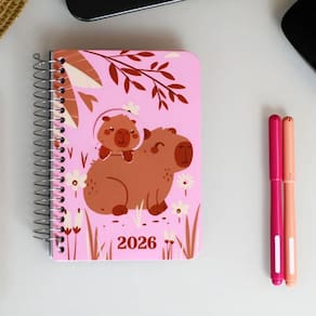 A Agenda 2026 Zoo Capivara é perfeita para quem ama produtos fofos e criativos. Com uma capa rosa vibrante e ilustração encantadora de uma capivara e seu filhote em um cenário floral, ela traz leveza e alegria para a rotina de organização.