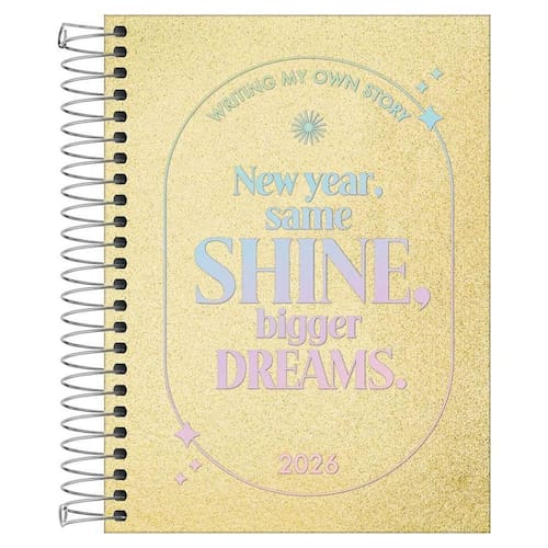 Se você busca um produto inspirado nas principais tendências de moda para se organizar, a agenda espiralada shine da tilibra é a escolha perfeita. O produto tem tamanho 11,7 x 16,4 cm, capa dura revestida com material especial brilhante e detalhes metalizados, bolsa de papel, adesivos em dobro e folhas com visão de 1 dia por página, exceto aos sábados e domingos. Esta agenda 2026, que possui 176 folhas, é escolha ideal para manter todas as tarefas e compromissos bem programados. Detalhes: bolsa: de papel decorada capa: com material especial e dura capa acabamento: com detalhe holográfico conteúdo: controle financeiro e listas folha de adesivos: dupla material: especial produto certificado: fsc visão: diária exceto sábado e domingo formato: 117mm x 164mm gramatura: 63 g/m número de folhas: 176 folhas atenção: imagem meramente ilustrativa. Pode ocorrer mudanças no tom da cor da tela do celular/pc para o produto real ou mudanças na embalagem do produto sem aviso prévio por parte do fabricante. Ean: 9789870017721