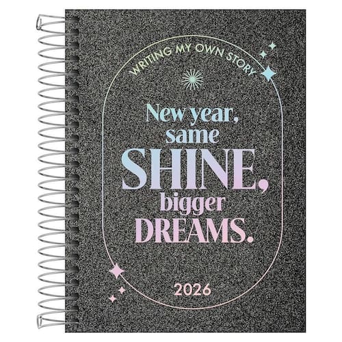 Se você busca um produto inspirado nas principais tendências de moda para se organizar, a agenda espiralada shine da tilibra é a escolha perfeita. O produto tem tamanho 11,7 x 16,4 cm, capa dura revestida com material especial brilhante e detalhes metalizados, bolsa de papel, adesivos em dobro e folhas com visão de 1 dia por página, exceto aos sábados e domingos. Esta agenda 2026, que possui 176 folhas, é escolha ideal para manter todas as tarefas e compromissos bem programados. Detalhes: bolsa: de papel decorada capa: com material especial e dura capa acabamento: com detalhe holográfico conteúdo: controle financeiro e listas folha de adesivos: dupla material: especial produto certificado: fsc visão: diária exceto sábado e domingo formato: 117mm x 164mm gramatura: 63 g/m número de folhas: 176 folhas atenção: imagem meramente ilustrativa. Pode ocorrer mudanças no tom da cor da tela do celular/pc para o produto real ou mudanças na embalagem do produto sem aviso prévio por parte do fabricante. Ean: 9789870017745