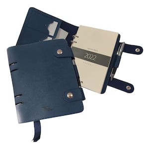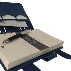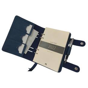 Agenda tipo fichário contendo, dados pessoais, calendários, datas importantes, anotações mensais, planejamento mensal, um dia por página (com exceção dos finais de semana), planejamento para o próximo ano, índice telefônico e lateral com marcações mensais.