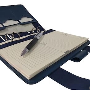 • Medidas 165 x 210 mm fechada, com aba para papéis e fechamento por botão magnético.