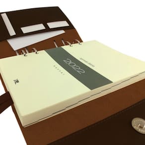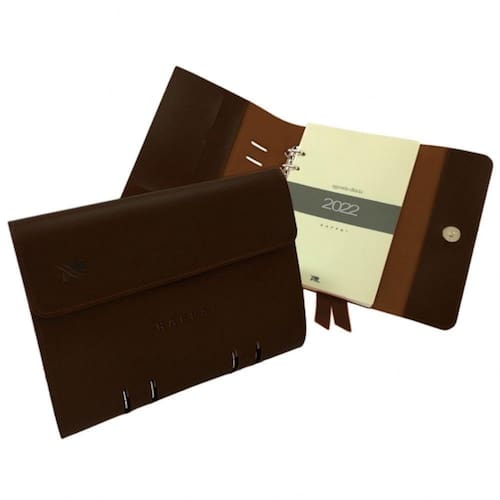 Agenda tipo fichário contendo, dados pessoais, calendários, datas importantes, anotações mensais, planejamento mensal, um dia por página (com exceção dos finais de semana), planejamento para o próximo ano, índice telefônico e lateral com marcações mensais.