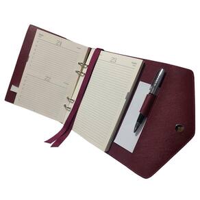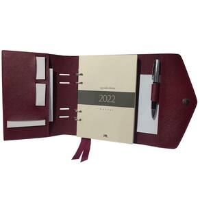 Agenda modelo envelope tipo fichário contendo, dados pessoais, calendários, datas importantes, anotações mensais, planejamento mensal, um dia por página (com exceção dos finais de semana), planejamento para o próximo ano, índice telefônico e lateral com marcações mensais.