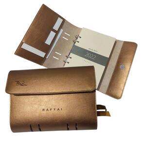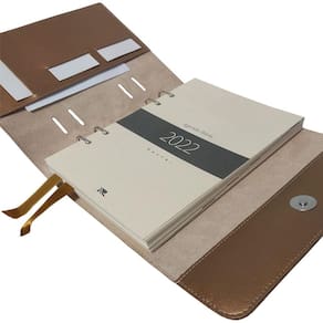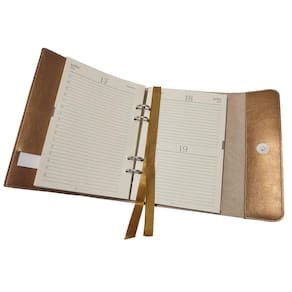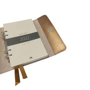 Agenda tipo fichário contendo, dados pessoais, calendários, datas importantes, anotações mensais, planejamento mensal, um dia por página (com exceção dos finais de semana), planejamento para o próximo ano, índice telefônico e lateral com marcações mensais.